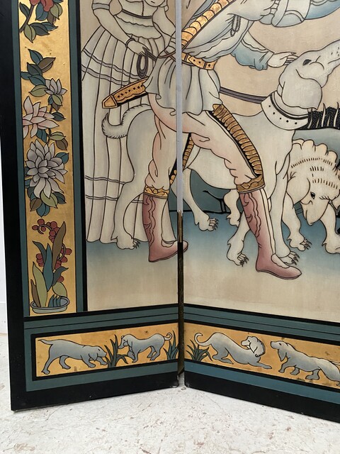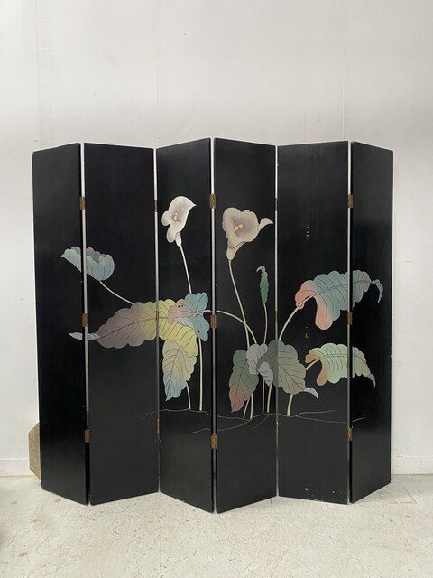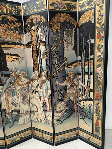 retrait dans notre entrepôt gratuitParavent a six feuilles décor sur fond noir thèmes couple lors de la promenade des chiens aux parc en pourtour décor floral sur fond doré dos du paravent décor floral Bon état de conservation Dimension H 214 cm L 45 x quatre panneaux cm P 2.5 cm début du . XX siècle .