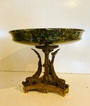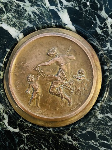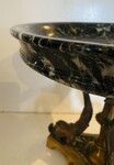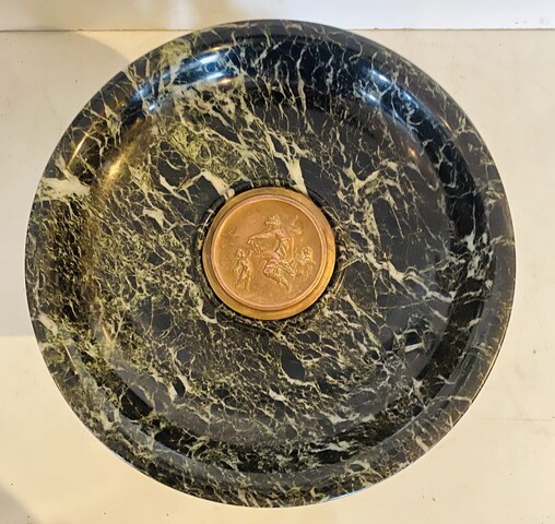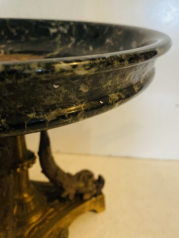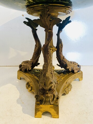 Vide poche en marbre et bronze Napoléon III Coupe en marbre vert de mer Piétement en bronze ciselé a décor de dauphins Bon état H 24 cm L 28 cm . XIX siècle .