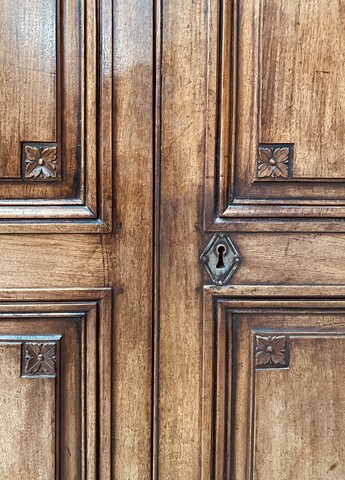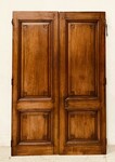 paire de portes en noyer massif à encadrement finement sculptée comporte système de crémone en fer martelé serrure présente plus clé H 160 cm L 104 cm P 2 cm . XIX siècle.