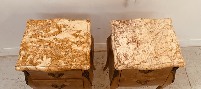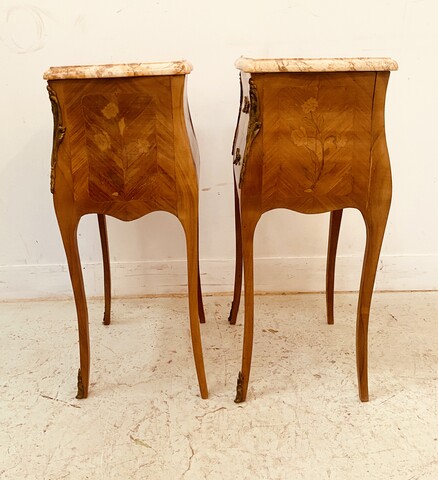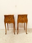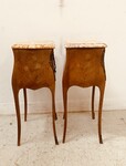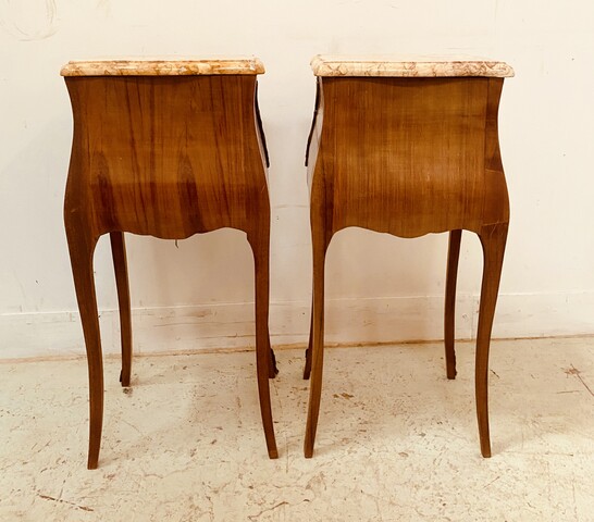 Paire de chevets de style Louis XV toutes faces galbé en placage de bois de rose dessus plateau en marbre Bon état Dimension H 73 cm L 33 cm P 29 cm du . XX siècle .