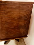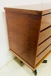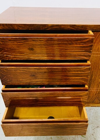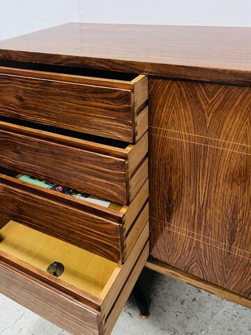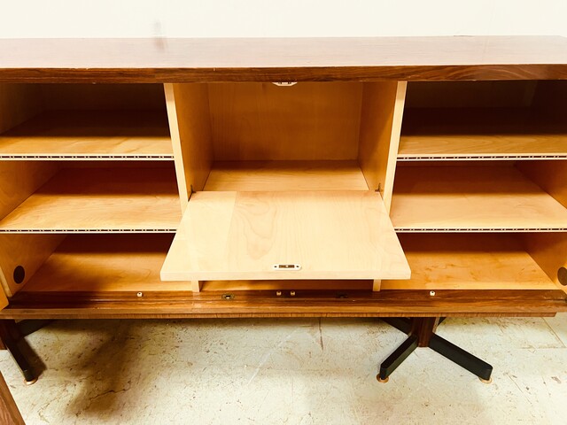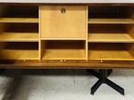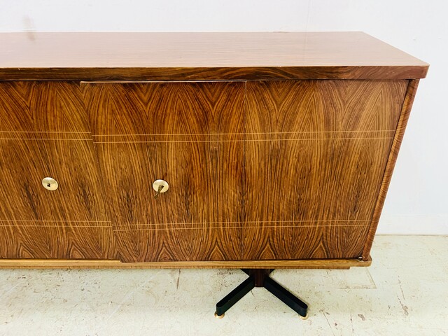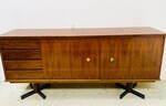 enfilade suédoise circa années 70 reposant sur deux pieds quadripode en métal noir ouvrant en façade par deux portes et une rangé de quatre tiroirs en façade H 100 cm L 220 cm P 50 cm . XX siècle .