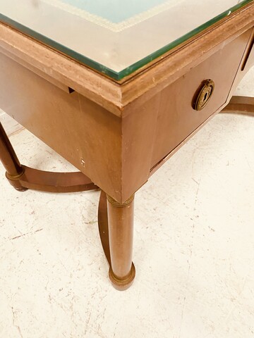bureau style empire en acajou et placage acajou piétement à entretoise dessus cuir comportant tirettes latéral verre de protection à Bissau comportant trois tiroirs en façade H 77 cm L 120 cm P 64 cm tirettes L 26 cm P 47cm . XX siècle .