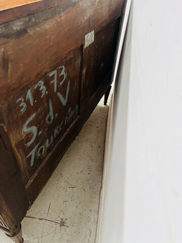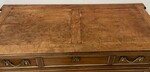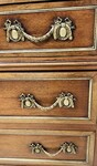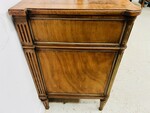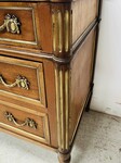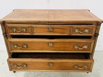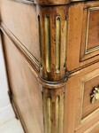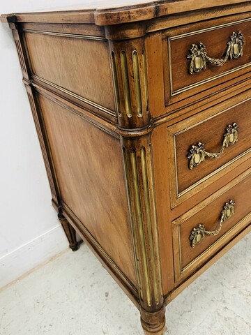 commode Louis XVI en acajou à montant arrondis comportant trois tiroirs en façade plateau à encadrement en bois agrémenté de filets et poignées de laiton H 87 cm L 120 cm P 54 cm milieu du . XIX siècle .