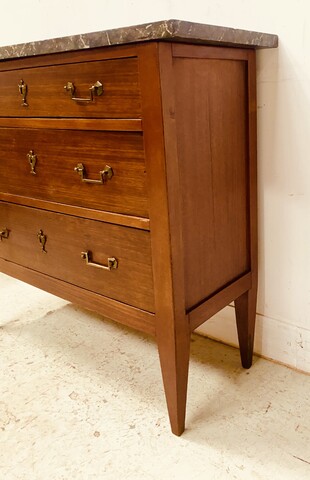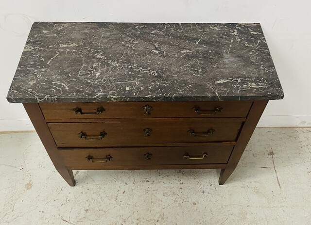 petite commode transition Louis XV louis XVI en acajou comportant trois tiroirs en façade sur un tiroir marque au fer plateau dessus marbre gris saint Anne (ancienne restauration d'usage ) H 83 cm L 87 cm P 34 cm . XIX siècle .