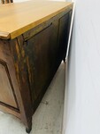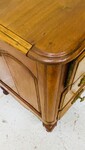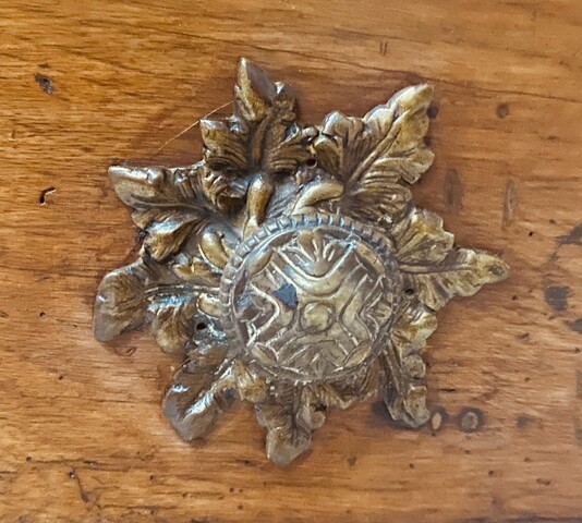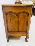 commode galbé en noyer massif dessus bois belle ornementation de bronze comportant en façade un rang de trois tiroirs coté chapelle (partie du plateau postérieur) H 80 cm L 112 cm P 54 cm (manque serrures ) . XVIII siècle .