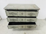 Commode arbalète de style louis XV patine à l'antique plateau dessus bois comportant trois tiroirs en façade poignées en bronze ossature en chêne massif Dimension H 84 cm L 82 cm P 41 cm début du . XX siècle .