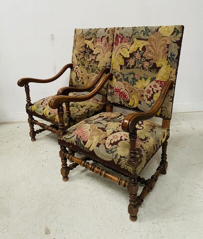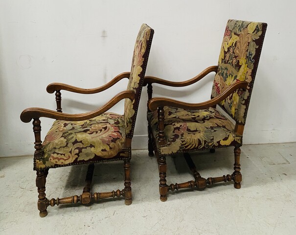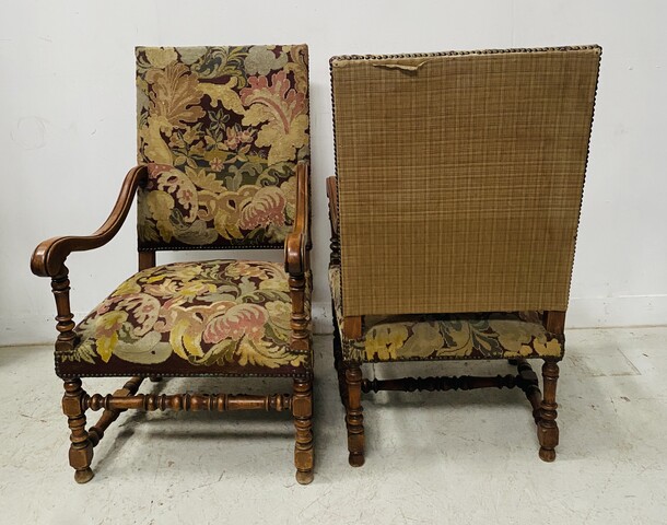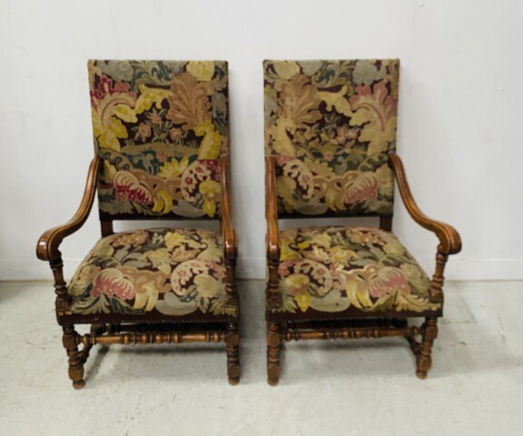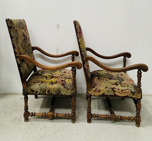 paire de fauteuils à haut dossier en noyer massif finement sculpté assises dossier recouvrement tissus à points piètement à entretoise H 110 L 60 cm P 50 cm début . XX siècle .