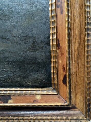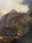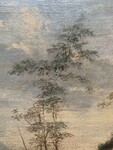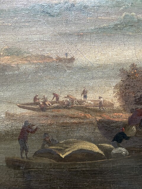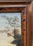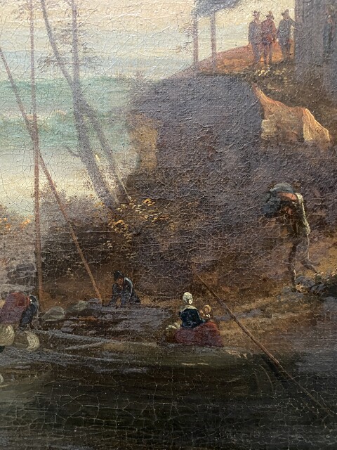 peinture sur toile paysage de montagne animé de personnages sur barque probablement paysage Italie beau cadre cadre H 67.5 cm L 76.5 cm P 4 cm peinture H 54 cm L 63 (vendu en l'état voir photos de détails) début du . XIX siècle .