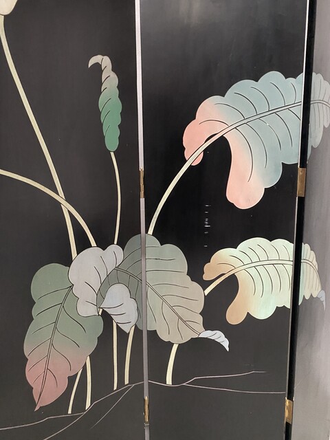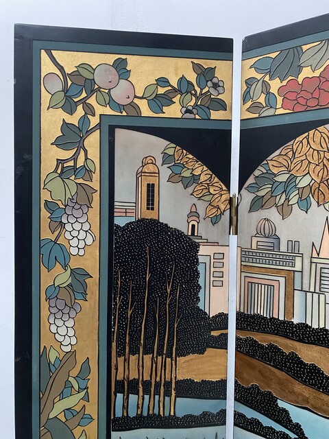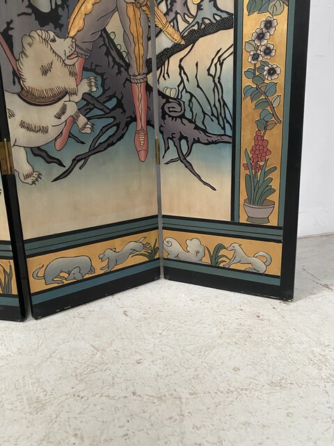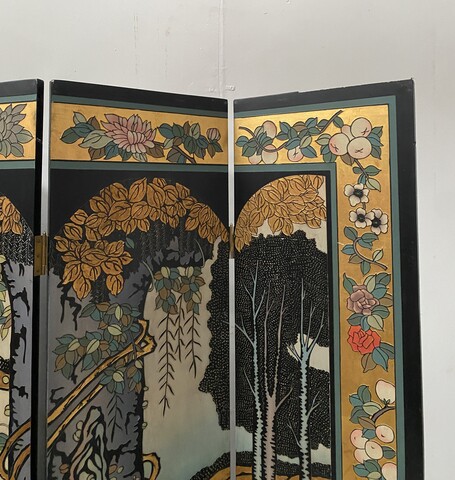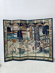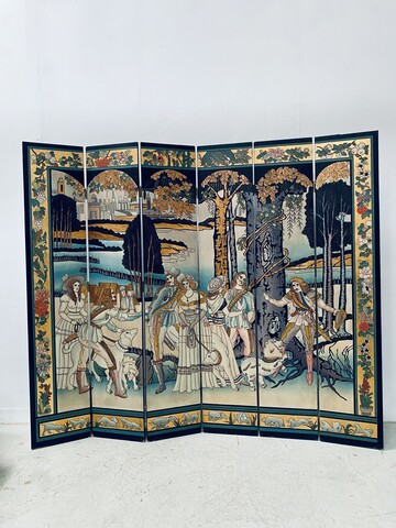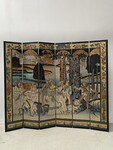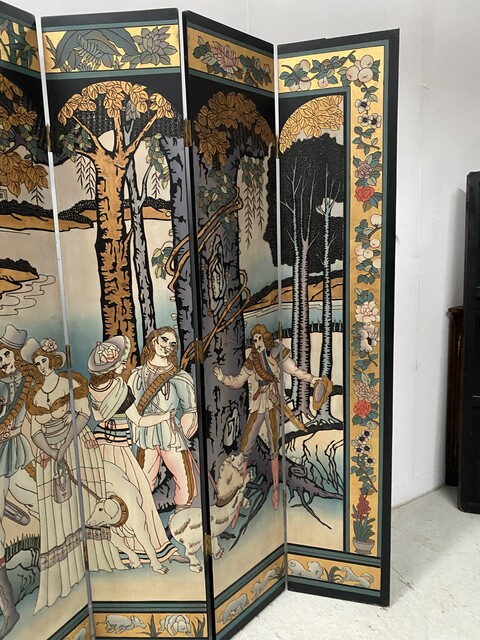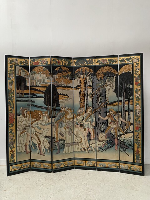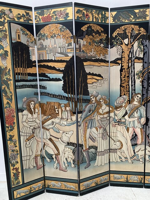 retrait dans notre entrepôt gratuitParavent a six feuilles décor sur fond noir thèmes couple lors de la promenade des chiens aux parc en pourtour décor floral sur fond doré dos du paravent décor floral Bon état de conservation Dimension H 214 cm L 45 x quatre panneaux cm P 2.5 cm début du . XX siècle .