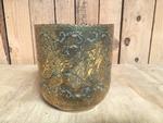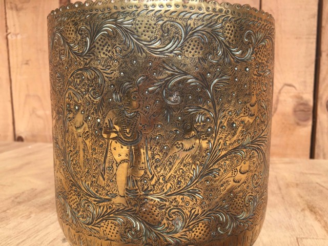 Curieux pot en laiton gravé et incisé Décor a motif d'oiseaux dans la végétation et d'un prince Perse Bon état ( enfoncement) Epoque XIX siècle Dimension H 18,5 x 16,5 cm