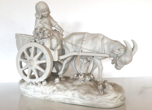 Charmant groupe en biscuit blanc Motif a décor d'une jeune fille sur un char tiré par un bouc Bon état Marque de fabrication sous le socle (Amphora Austria ) Epoque fin XIX début XX siècle Dimension L 40 x H 30 x 15 cm
