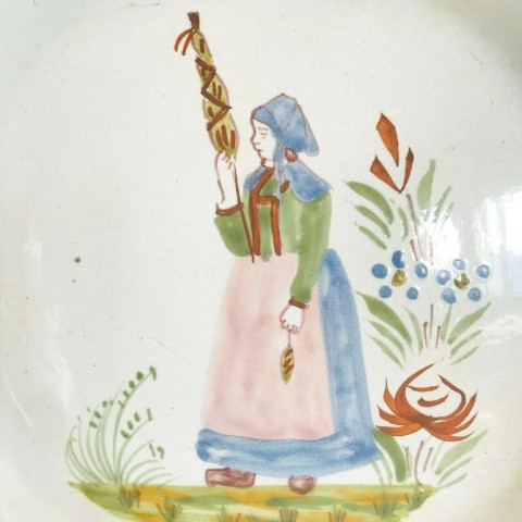 Belle assiette en faïence polychrome Motif a décor d'une paysanne Bretonne Porte la marque G-B sous l'assiette et la signature " henriot quimper "dans le décor ( petite égrenure) . XIX siècle. Dimension diamètre 25 cm
