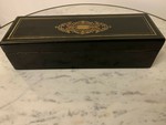 Boite a gants Napoléon III Coffret en bois noir Triple incrustations de filets de laiton Joli médaillon en marqueterie de laiton gravé et de bois de rose Ancienne restauration voir la photo Bon état Dimension H 8 x L 28 x 10 cm Epoque XIX siècle
