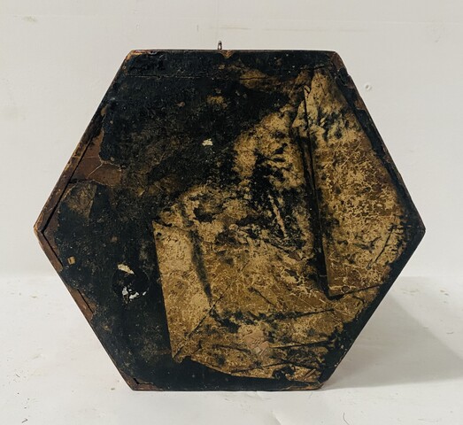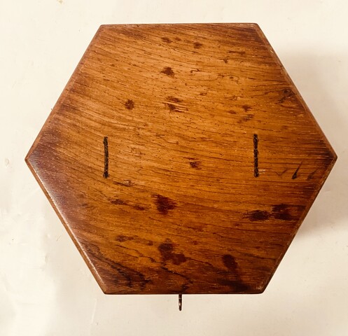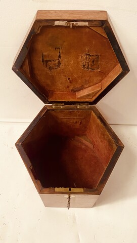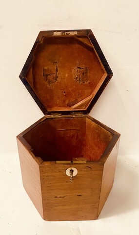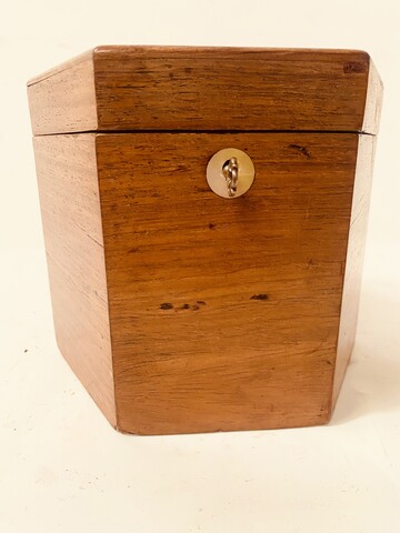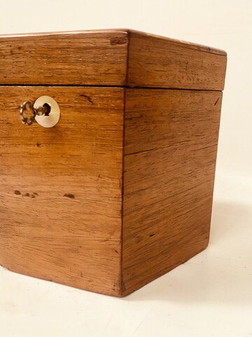 coffret octogonale en noyer massif patiné comportant la clé Clé et serrure fonctionnelle H 17 cm L 21 cm P 18 cm . XIX siècle .