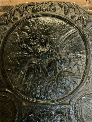 Plaque de fond de cheminée en fonte de fer Un décor a l'antique dans un médaillon Bon état Dimension H 50 x L 47 x 2.5 cm XX siècle