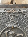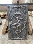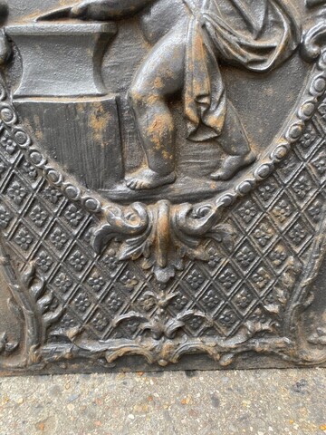 Plaque de fond de cheminée en fonte de fer Décor dans un ovale d'un angelot forgeron Bon état Dimension XX siècle