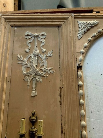 Boiserie en alcôve de style Louis XVI Panneau en sapin patiné Deux décors stylisés en stuc Décor de perles en stuc au pourtour Bon état Dimension H 247 x L 360 x 6 cm Epoque XIX siècle