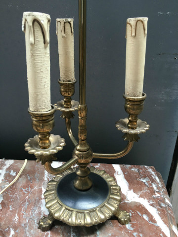 Paire de lampe Bouillotte en bronze Model a double patine Trois bras de lumière Piétement a godrons et pieds griffes Bon état Dimension H 52 cm / diamètre 18 cm
