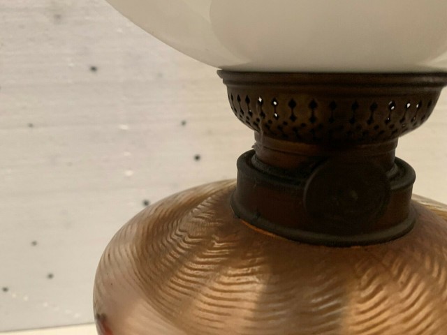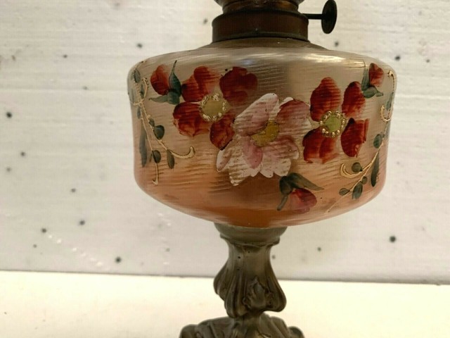 Ancienne lampe a pétrole Piétement en régule patiné Réserve en verre a décor floral Bon état Dimension lampe H 30 x 15 cm hauteur totale H 60 x 15 cm XX siècle Expédition en deux colis