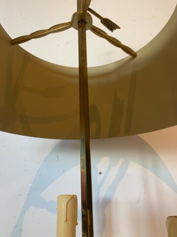 Lampe bouillotte en bronze Socle rond a trois bras de lumière Abat jour en tôle patinée verte a décor de fleurs peintes Bon état Dimension H 60 x L 35 x 32 cm XX siècle Plus de photos sur simple demande TEL 0609061579 Pour une livraison a l’international, me contacter merci