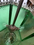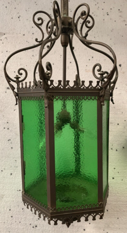 Lanterne de vestibule a six pans Monture en bronze et laiton patiné Verre a ondulation de couleur verte Bon état Dimension H 126 x L 33 x 33 cm lanterne seule H 78 cm