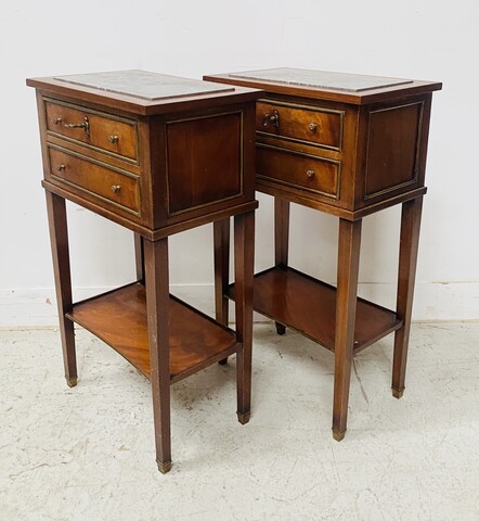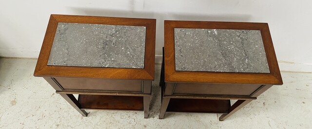 Paire de chevets style transition en placage et bois massif teinté comportant deux tiroirs en façade avec clés dessus marbre sur encadrement Bon état Dimension H 73 cm L 43 cm P 27 cm milieu du . XX siècle .