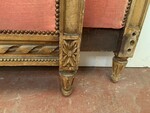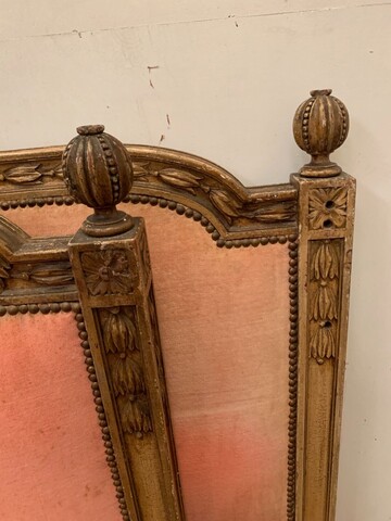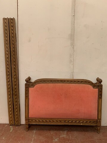 Lit de style Louis XVI en hêtre patiné Encadrement sculpté et doré Ossature en bon état Tissus a revoir Dimension H 94 x L 130 x 190 cm Literie standard 120 x 190 cm XX siècle