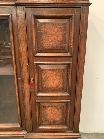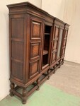 Bibliothèque de style renaissance en chêne massif Cinq portes en façade dont deux vitrées Piétement boules a entretoise Bon état Dimension H 176 x L 278 x 45 cm XX siècle