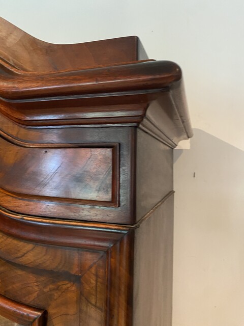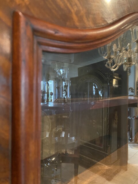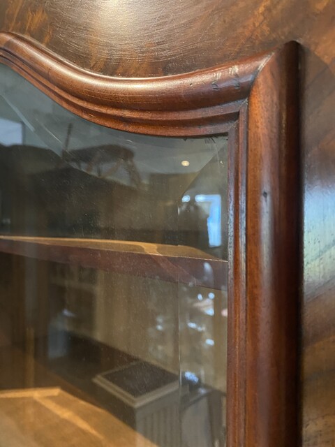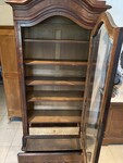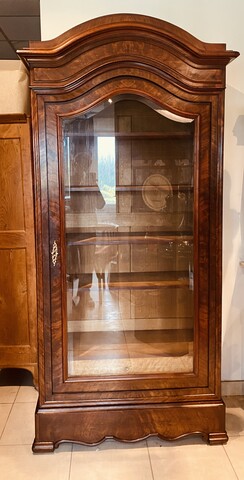 vitrine époque Louis Philippe en placage d'acajou flamé ouvrant en façade par une porte vitrée verre biseauté comporte un tiroir en partie basse intérieur quatre étagères plus un tiroir à clés H 220 cm L 110 cm P 42 cm . XIX siècle .
