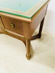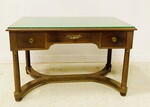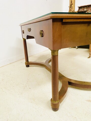 bureau style empire en acajou et placage acajou piétement à entretoise dessus cuir comportant tirettes latéral verre de protection à Bissau comportant trois tiroirs en façade H 77 cm L 120 cm P 64 cm tirettes L 26 cm P 47cm . XX siècle .