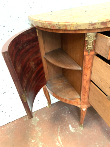 Commode en demi lune de style Louis XVI Placage sur chêne d'amarante et de bois de rose Trois tiroirs en façade en marqueterie a fond de cubes Une porte de chaque coté dans la partie arrondie Quatre pieds gaines a sabots et bagues de bronze Dessus en plateau de marbre breche Bon état Dimension H 85 x L 83 x 40 cm XX siècle Plus de photos sur simple demande TEL 0609061579 Pour une livraison a l’international, me contacter merci