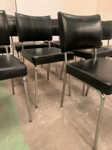 Suite de neuf chaises vintage Piétement en tubes carrés chromés Recouvrement en simili cuir noir Bon état Dimension H 81 x L 41 x 38 cm XX siècle