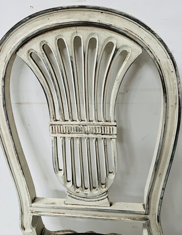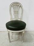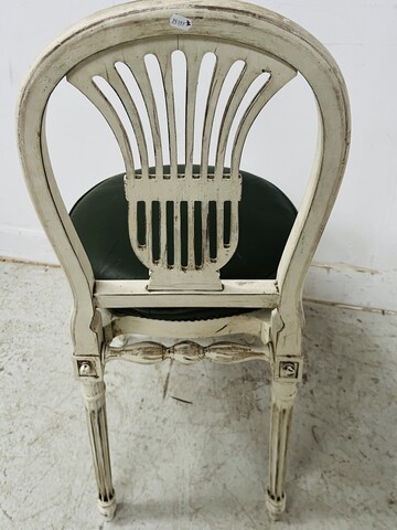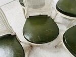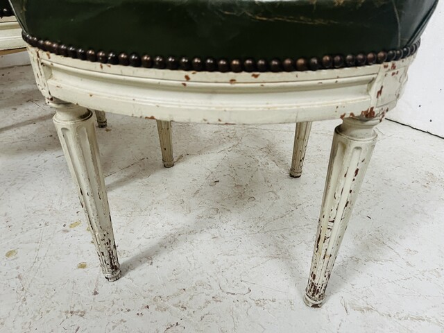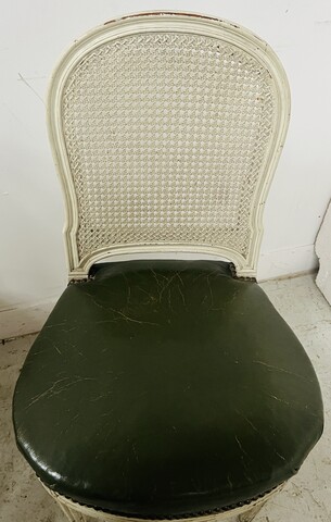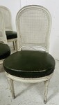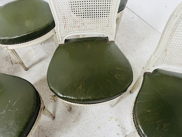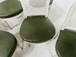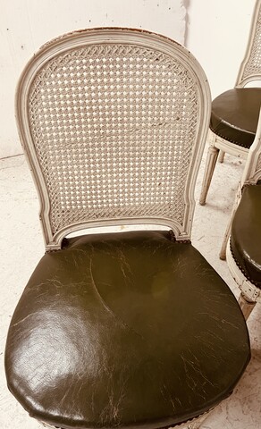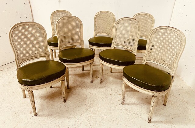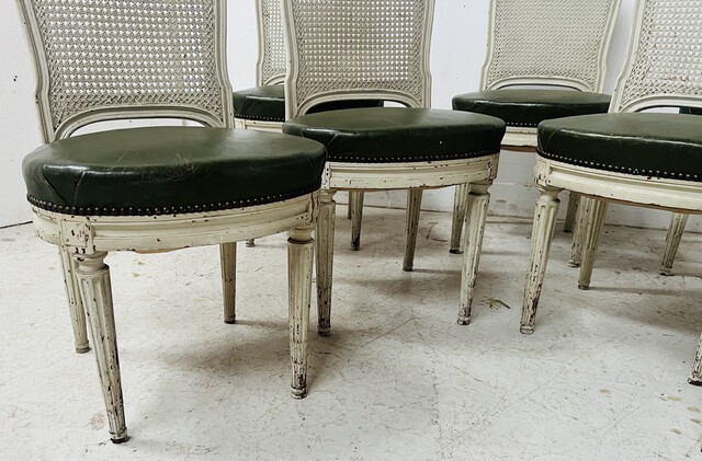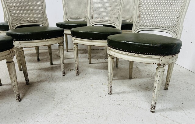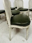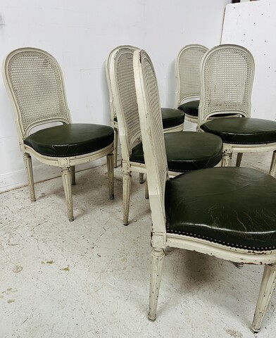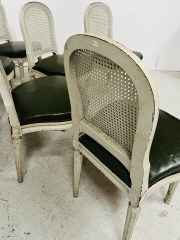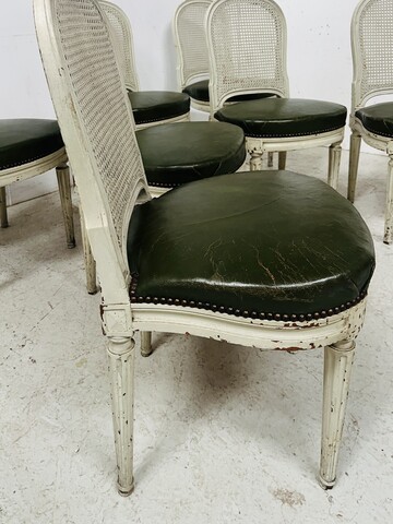 suite de sept chaises en bois patiné antique de style Louis XVI finement sculptée dossier en cannage assise en cuir vert antique H 87 cm L 45 cm P 45 cm assise H 49 cm (on joint une septième chaise) fin du . XIX siècle .
