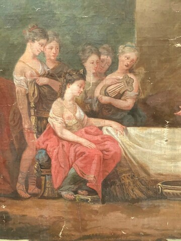 Grande toile peinte décorative Décor d'une scène a l'antique Usures voir les photos Dimension H 260 x L 395 cm XIX siècle