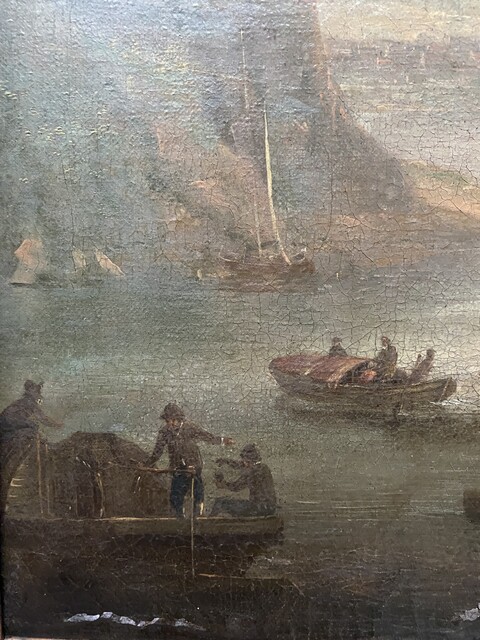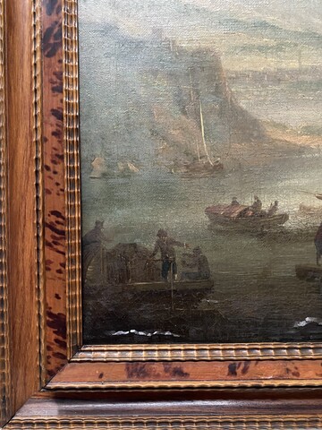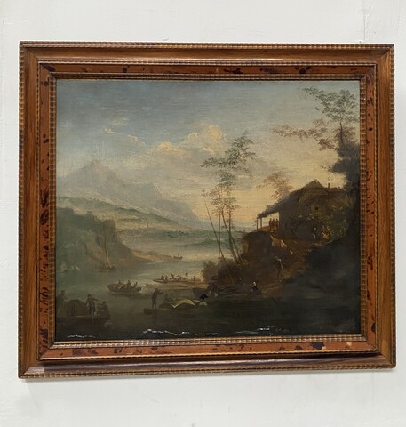 peinture sur toile paysage de montagne animé de personnages sur barque probablement paysage Italie beau cadre cadre H 67.5 cm L 76.5 cm P 4 cm peinture H 54 cm L 63 (vendu en l'état voir photos de détails) début du . XIX siècle .